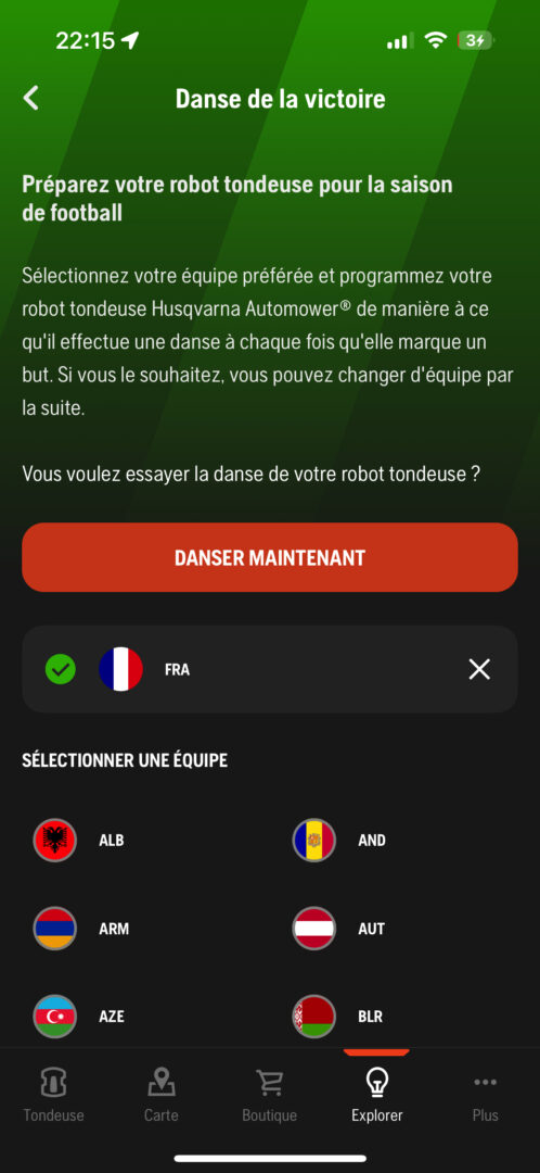 Pour bénéficier de cette fonctionnalité, les utilisateurs doivent sélectionner leur équipe préférée via l’application Automower® Connect. À chaque but marqué, le robot effectuera une danse, clignotera et jouera une musique triomphante. L’écran intégré de l’Automower® affichera également le score du match en temps réel.